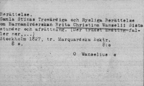 //// Berättelse . //// Samla Stina» Trovärdiga och Rysliga Berättelse om Barnamorderskatt Brita Christina Wanselii Sista stunder och afrättnlrf^/T^r Tfam^aMnrWfc» faller ner,...) //// 3tockholm 1827, tr. Marquardaka -tokir. 8 s. 8: o //// O Wanselius a ////