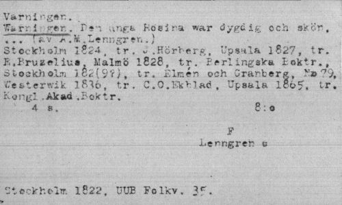 //// Varningen. //// rr: 1 ger.. Pen ungt Ko el ra war dygd ig och skör, 777 ' r-v . M , Lenr.gr . j //// Stockholm 18-24, tr. « .Körberg, Upsnla i 827, tr. E.Bruzeliue Malmö 1828, tr. Berlingska Boktr., StockhoLtj 162(9?), tr. Elmén och Granberg, 79, ffeaterwik 1816, tr. C.0.Ekblad , Upsala 186?, tr. Kongl Ak ad .Boktr. //// 4 s. 8: o //// F //// Lenngrer c //// Stockholm 1822, UUE Folkv. ////