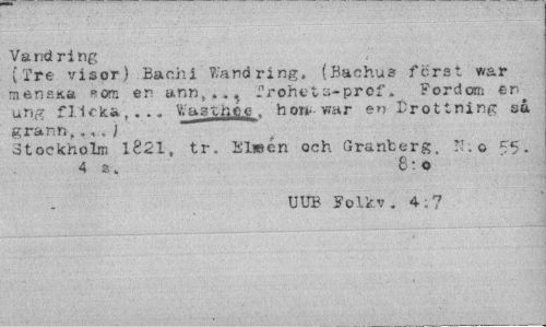 //// Vandring //// (Tre visor) Baohi ?.'and ring. (Bachus först war mensKa *om en ann, ,.t Troheta-prof. Fordom en ung flicka,... Waathee ho» war en Drottning sa grann,, *.} //// Stockholm 1821, tr. Siw en och Granberg. !I.o 55. 4 s„ t: o //// UUB Folkv. 4:7 ////