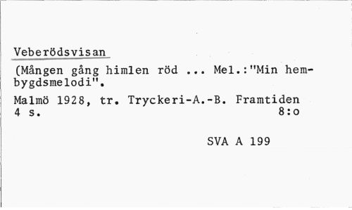 //// Veberödsvisan //// (Mången gång himlen röd ... Mel.:"Min hembygdsmelodi". //// Malmö 192 8, tr. Tryckeri-A.-B. Framtiden 4 s. 8:0 //// SVA A 199 ////