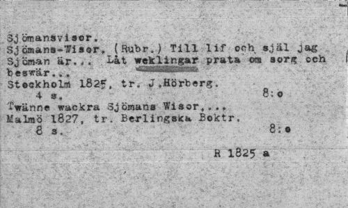 //// 3j ömanavisor. //// Sj ömans-lisor. (Bubr.) Till lif och själ jag Sjöman år.-, £*at weklingår prata om sorg och beswär... "liHIWHl... , //// Stockholm l82f, tr, J.Hörberg. //// 4a. 8;o //// Twänne wackra Sjömans Wisor,... Malmö 1827, tr. BerlingsKa Boktr. . B s. ' 8: • //// R 1825 a ////