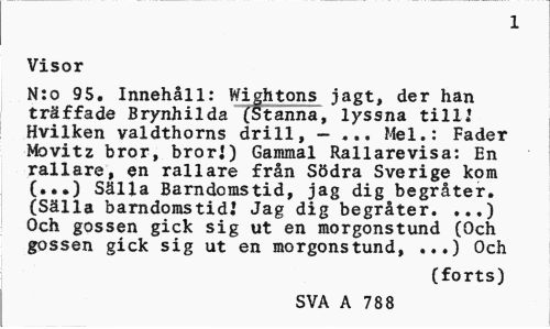 //// 1 //// Visor //// N:o 95. Innehåll: Wightons jagt, der han träffade Brynhilda (Stanna, lyssna tillJ Hvilken valdthorns drill, - ... Mel.: Fader Movitz bror, bror.') Gammal Rallarevisa: En rallare, en rallare från Södra Sverige kom (...) Sälla Barndomstid, jag dig begråter. (Sälla barndomstid! Jag dig begråter. ...) Och gossen gick sig ut en morgonstund (Och gossen gick sig ut en morgonstund, ...) Och //// (forts) //// SVA A 788 ////