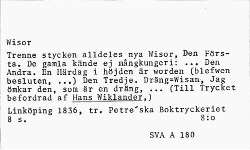 //// Wisor //// Trenne stycken alldeles nya Wisor, Den Första. De gamla kände ej mångkungeri: ... Den Andra. En Härdag i höjden är worden (blefwen besluten, ...) Den Tredje. Dräng=Wisan, Jag ömkar den, som är en dräng, ... (Till Trycket befordrad af Hans Wiklander.1 //// Linköping 1836, tr. Petre'ska Boktryckeriet 8 s. 8:0 //// SVA A 180 ////