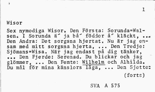 //// * //// 1 //// Wisor //// Sex nymodiga Wisor i, Den Första: Sorunda=Wal-sen* I Sorunda ja hå" föddcr å' kläckt, ... Den Andra: Det sorgsna hjertat. Nu är jag ensam med mitt sorgsna hjerta, ... Den Tredje: Sjömans=Wisa. När jag endast på dig tänker, ... Den Fjerde: Serenad. Du blickar och jag glömmer, ... Den Femte: Wilhelm och Alhilda. Du mål för mina känslors låga, ... Den Sjette: //// (forts) //// SVA A 575 ////