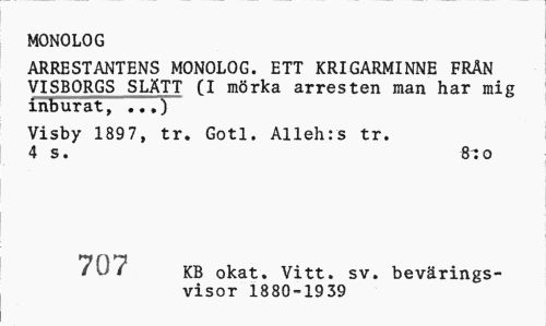 //// MONOLOG //// ARRESTANTENS MONOLOG. ETT KRIGARMINNE FRÄN VISBORGS SLÄTT (I mörka arresten man har mig inburat, ..,) //// Visby 1897, tr. Gotl. Alleh:s tr. 4 s. 8": o //// 707 KB okat. Vitt. sv. bevärings- //// visor 1880-1939 ////