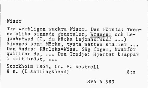 //// Wisor //// Tre werkligen wackra Wisor, Den Första: TVen-ne olika sinnade generaler, Wrängel och Le-jonhufwud (0, du käcka Lejonhufwud.' ...) Sjunges som: Mörka, tysta natten ställer Den Andra: Kärleks=Wisa. Säg fogel, hwarför qwittrar du, ... Den Tredje: Hjertat klappar i mitt bröst, ... //// Stockholm 1864, tr. E. Westrell 8 s. (I samlingsband) 8:o //// SVA A 5 83 ////