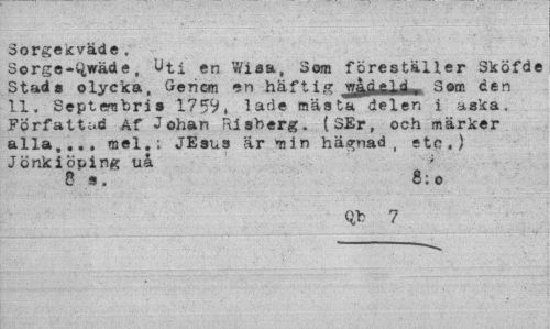 //// Sorgekväde , //// Sorge-^wäde, Uti en Wisa, Som föreställer Sköfde Stads olycka, Ge hem en h&ft.i t w^d.eld. Som den 11. Septerabris 1759» lade masta delen i aska. Författad Af Johan Risberg. (SEr, och märker alla,... mel,; JEsua armin hägnad, etc.) Jönkiöping uå - //// B a. 8;o //// W 7 ////