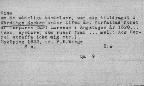 //// Visa //// om de wådeliga händelser, som sig tilldragit i Wårdinge Socken under Elfwa år; författad föret SJ rörpär^'TJar 1 Larsson i Äng stugan år 1820... (Ack, syndare, som rusar fram ... mel.: Ack Her-rel straffa icke mig etc.) Nyköping 1822, tr. ?.E.1inge //// 8 s. 8.0 //// Qa 9 ////