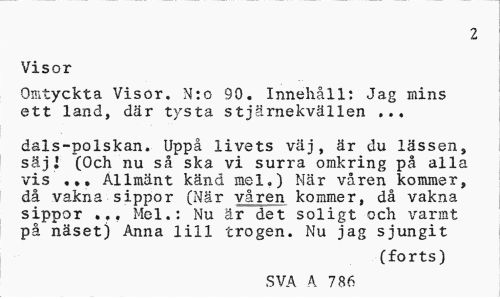//// 2 //// Visor //// Omtyckta Visor. N:o 90. Innehåll: Jag mins ett land, där tysta stjärnekvällen ... //// dals-polskan. Uppå livets väj, är du lässen, säj i (Och nu så ska vi surra omkring på alla vis ... Allmänt känd mel.) När våren kommer, då vakna sippor (När våren kommer, då vakna sippor ... Mel.: Nu är det soligt och varmt på näset) Anna lill trogen. Nu jag sjungit //// (forts) //// SVA A 786 ////