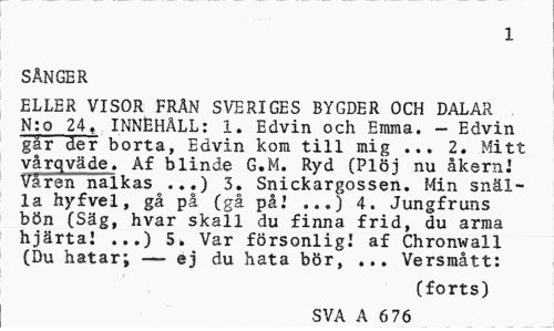 //// 1 //// SÅNGER //// ELLER VISOR FRÄN SVERIGES BYGDER OCH DALAR N:o 24, INNEHÅLL: 1. Edvin och Emma. - Edvin går der borta, Edvin kom till mig ... 2. Mitt vårqväde. Af blinde G.M. Ryd (Plöj nu åkern.' Våren nalkas ...) 3. Snickargossen. Min snälla hyfvel, gå på (gå på! ...) 4. Jungfruns bön (Säg, hvar skall du finna frid, du arma hjärta! ...) 5. Var försonlig! af Chronwall (Du hatar; — ej du hata bör, ... Versmått: //// (forts) //// SVA A 6 76 ////