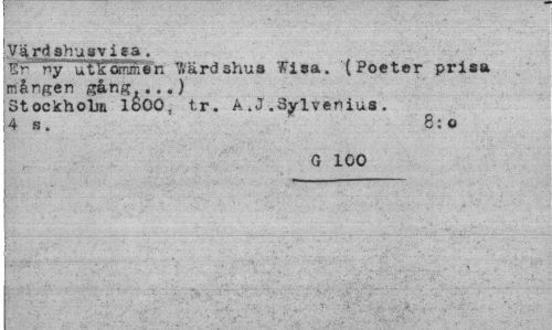 //// Värdshusvisa . //// Er njTlITEommYn '.Värdshus Wisa. (Poeter prisa mången gång ... ) //// Stockholm loOO, tr. A .J.Sylvenius. //// 4s. S:o //// G 100 ////