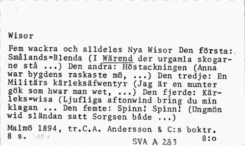 //// Wisor //// Fem wackra och alldeles Nya Wisor Den första:. Smålands=Blenda (I Wärend der urgamla skogarne stå-...) Den andra: Höstackningen (Anna war bygdens raskaste mö, ...) Den tredje: En Militärs kärleksäfwentyr (Jag är en munter gök som hwar man wet, ...) Den fjerde: Kär-leks=wisa (Ljufliga aftonwind bring du min klagan ... Den femte: SpinnJ Spinn! (Ungmön wid sländan satt Sorgsen både .,.) //// Malmö 1894, tr.C.A. Andersson & C:s boktr» 8 s* \ 8:0 ////