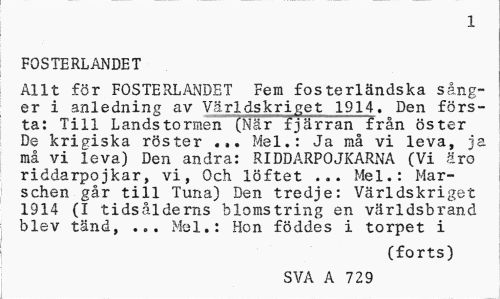 //// 2 //// FOSTERLANDET //// Allt för FOSTERLANDET Fem fosterländska sånger i anledning av Världskriget 1914. Den första: Till Landstormen (När fjärran från öster De krigiska röster ... Mel.: Ja må vi leva, ja må vi leva) Den andra: RIDDARPOJKARNA (Vi äro riddarpojkar, vi, Och löftet ... Mel.: Marschen går till Tuna) Den tredje: Världskriget 1914 (I tidsålderns hlomstring en världsbrand blev tänd, ... Mel.: Hon föddes i torpet i //// (forts) //// SVA A 691 ////