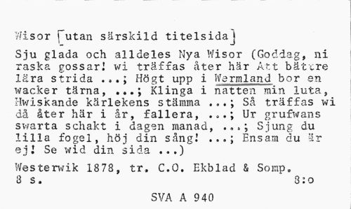 //// Wisor Tutan särskild titelsidaj //// Sju glada och alldeles Nya Wisor (Goddag, ni raska gossarj wi träffas åter här Att bättre lära strida Högt upp i Wermland bor en //// wacker tärna, klinga i natten min luta, //// Hwxskande kärlekens stämma .Så träffas wi då åter här i år, fallera, .Ur grufwans sv/arta schakt i dagen manad, Sjung du //// lilla fogel, höj din sång.' ...; Ensam du är ej,' Se wid din sida ...) //// Westerwik 18 78, tr, C.O. Ekblad & Somp» 3 s. 3:o //// SVA A 9 40 ////