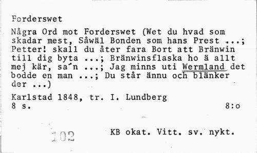 //// Forderswet //// Några Ord mot Forderswet (Wet du hvad som skadar mest, Såwäl Bonden som hans Prest PetterI skall du åter fara Bort att Bränwin till dig byta Bränwinsflaska ho ä allt //// mej kär, sa'n .Jag minns uti Wermland det bodde en man ...; Du står ännu och blänker der ...) //// Karlstad 1848, tr. I. Lundberg 8 s. 8:0 //// - ¦ n1 o K® okat. Vitt. sv. nykt. //// J„ >.J ////