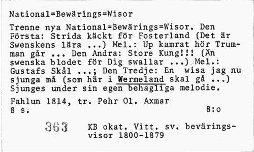 //// National=Bewärings»Wisor //// Trenne nya National=Bewärings=Wisor. Den Första: Strida käckt för Fosterland (Det är Swenskens lära ...) Mel.: Up kamrat hör Trumman går ... Den Andra: Store Kung!11 (Än swenska blodet för Dig swallar ...)jMel.: Gustafs Skål .Den Tredje: En wisa jag nu sjunga må (som här i Wermeland skal gå ...) Sjunges under sin egen behagliga melodie» //// Fahlun 1814, tr. Pehr 01. Axmar 8 s. 8:o //// 3B3 kb okat. Vitt. sv. bevärings-visor 1800-1879 ////