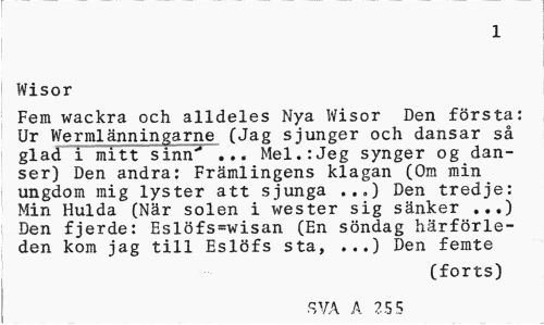 //// 2 //// Wisor //// Fem wackra och alldeles Nya Wisor Den första: Ur Wermlänningarne (Jag sjunger och dansar så glad i mitt sinn" ... Mel.:Jeg synger og danser) Den andra: Främlingens klagan (Om min ungdom mig lyster att sjunga ..„) Den tredje: Min Hulda (När solen i wester sig sänker ...) Den fjerde: Eslöfs=wisan (En söndag härförleden kom jag till Eslöfs sta, ...) Den femte //// (forts) //// SVA A 691 ////