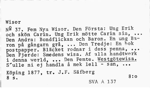 //// Wisor //// N- 37. Fen Nya Wisor. Den Första: Ung Erik och skön Carin. Ung Erik mötte Carin sin, ... Den Andra: Bondflickan och Baron. En ung Baron på gångarn grå, ... Den Tredje: En bok postpapper. Bläcket rodnar i dess penna, ... Den Fjerde: Smedens wisa. Af alla handtwerk i denna xverld, ... Den Femte. Westgötewisa. S"ulle ni ej handla å mek lell - san, ... //// Köping 1877, tr. J.F. Säfberg 8 s. 8:o //// SVA A 137 ////
