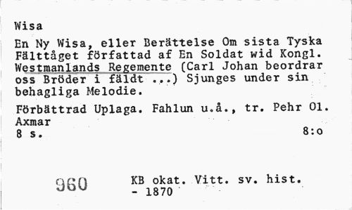 //// Wisa //// En Ny Wisa, eller Berättelse Om sista Tyska Fälttåget författad af En Soldat wid Kongl. Westmanlands Regemente (Carl Johan beordrar oss Bröder i fäldt ...) Sjunges under sin behagliga Melodie. //// Förbättrad Uplaga. Fahlun u.å., tr. Pehr 01. Axmar //// 8 s. 8:0 //// Qf»n KB okat. Vitt. sv. hist. //// JOU - 1870 ////