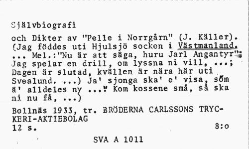 //// Självbiografi //// och Dikter av "Pelle i Norrgårn" (J. Käller). (Jag föddes uti Hjulsjö socken i ... Mel.: "Nu är att säga, huru Jarl Ångan tyr Jag spelar en drill, om lyssna ni vill, Dagen är slutad, kvällen är nära här uti Svealund. ...) Ja' sjonga ska' e' visa, söm ä1 alldeles nv ...V Kom kossene små, så ska ni nu få, ,,.) //// Bollnäs 19 33, tr. BRÖDERNA CARLSSONS TRYCKERI-AKTIEBOLAG //// 12 s. 8:o //// SVA A 1011 ////