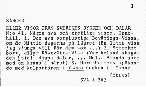 //// 1 //// sånger //// ELLER VISOR FRÄN SVERIGES BYGDER OCH DALAR N:o 41. Några nya och trefl.iga visor. Innehåll. 1. Den nya sorglustiga Bevärings-Visan, om de Nittio dagarna på lägret (En liten visa jag sjunga vill För dem som ...) 2. Strecket bort, eller Rösträtts-Visa (Var helsad skogar dch £sicj] djupa dalar, ... Mel.: Amanda satt med en krans i håret) 3. Horn-Petters spökande med kolportören i Ysane socken (I Ysane //// (forts) //// SVA A 282 ////