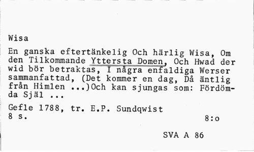 //// Wisa //// En ganska eftertänkelig Och härlig Wisa, Om den Tilkommande Yttersta Domen, Och Hwad der wid bör betraktas, I några enfaldiga Werser sammanfattad, (Det kommer en dag, Då äntlig från Himlen ...)Och kan sjungas som: Fördömda Sj äl ... //// Gefle 1788, tr. E.P. Sundqwist 8 s. 8:0 //// I SVA A 86 ////