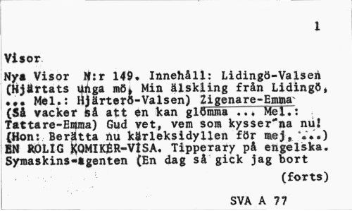 //// 1 //// Visor //// Nys Visor H:r 149, Innehåll: Lidingö-Valseri (Hjärtats unga mö» Min älskling från Lidingö, ••• Mél.: Hjärtero-Valsen) Zigenare-Emma (Så vacker iså att en kan glömma 777 Mel.: Tattare-Emma) Gud vet, vem som kysser"na nu! (Hon: Berätta nu karleksidyllen för mej, V*.) EN ROLIG KOMIKÉR-VISA. Tipperary på engelska. Symaskins-»tgenten (En dag så gick jag bort //// (forts) SVA A 77 ////