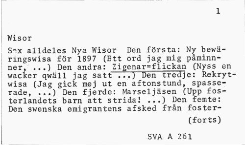 //// 1 //// Wisor //// S^x alldeles Nya Wisor Den första: Ny bewä-ringswisa för 1897 (Ett ord jag mig påminn-ner, ...) Den andra: Zigenar=flickan (Nyss en i wacker qwäll jag satt .7.) Den tredje: Rekryt-wisa (Jag gick mej ut en aftonstund, spasse-rade, ...) Den fjerde: Marseljäsen (Upp fosterlandets barn att stridal ...) Den femte: Den swenska emigrantens afsked från foster- //// (forts) //// SVA A 261 ////