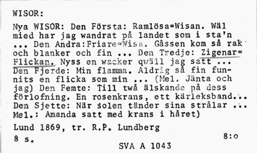 //// WISOR: //// Nya WISOR: Den Första: Ramlösa=Wisan. Wäl mied har jag wandrat på landet som i sta'n ... Den Andra:Friare-Wisa. Gåssen kom så rak och blänker och fin ... Den Tredje: Zigenar= Flickan. Nyss en wacker qwäll jag satt ... Den Fjerde: Min flamma. Aldrig så fin funnits en flicka som min ... (Mel. Jänta och jag) Den Femte: Till twå älskande på dess förlofning. En rosenkrans, ett kärleksband..? Den Sjette: När Solen tänder sina strålar ... Mel.: Amanda satt med krans i håret) //// Lund 1869, tr. R.P. Lundberg //// 8 s 8:0 //// SVA A 104 3 ////