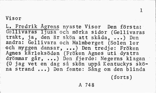 //// 1 //// Visor //// L. Fredrik Ågrens nyaste Visor Den första: Géllivaras ljusa och mörka sidor (Géllivaras trakt, ja, den är skön att skåda, ...) Den andra: Gellivara och Malmberget (Solen ler och myggen dansar, ...) Den tredje: Fröken Agnes kärleksöden (Fröken Agnes uti dystra drömmar går, ...) Den fjerde: Negerns klagan (0 jag vet en dag så skön uppå Kentuckys sköna strand ..,) Den femte: Sång om den blinda //// (forts) //// A 748 ////