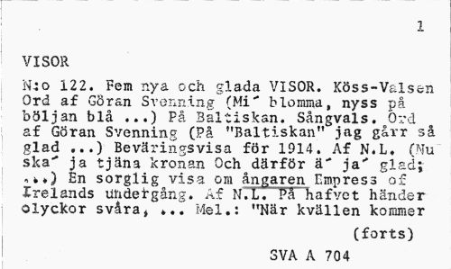 //// 1 //// VISOR //// Ni o 122. Fem nya och glada VISOR. Köss-Vals&n Ord af Göran Svenning (Mi" blomma, nyss på böljan blå ...) På Baltiskan. Sångvals. Ord af Göran Svenning (På "Baltiskan" jag gårr så glad ...) Beväringsvisa för 1914. Af N*L. (Nu ska"' ja tjäna kronan Och därför ä" ja' glad; //// En sorglig visa om ångaren Empress o£ Xrelands undetgång. Af N.L. Ta hafvet händer olyckor svåra, *.. Mel.: "När kvällen kommer //// (forts) //// SVA A 704 ////