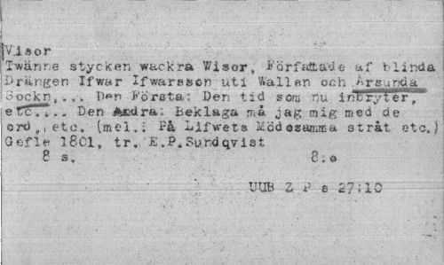 //// [Visor //// Twänne stycken wackra Wisor, -Författad e af blinda Drängen Ifwar Ifwarseon uti Wallftn och Arsonaa oockr,.,» B»*n Första; Den tid son» nu i ni r/i erf* e re T 4 . - Den A*-dra: Beklaga ma jag »nig med de ort), <-etc. (mel.i Lifvreta Mödostai.ma stråt etc.) G ef le 18C1, tr, £.P.Surdqvist //// 8 s. g.o //// UUB Z .i3 e 27; 10 ////