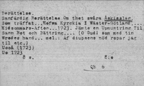 //// Berättelse. //// Sanfärd ig Berättelse Om thet swåra Ask i eylarv Som träffat. . .Hofwa Kyrckia I Wäster^OÖt lan?*, .,. Mid sommars-Aften.. ,1.723 . Jä^te en Upmuntrin? Til Sann Bot och Bättring,.,» (O Gud 1 som med ti» Wredes hand... mel.: Af diupsens nod ropar jag til etc.) Uooå (1723) Uo 1723 //// 8a, 8; o //// __6 ////