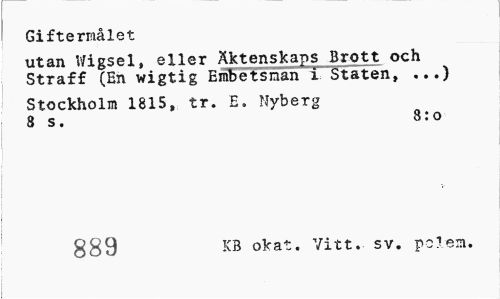 //// I Giftermålet //// utan Wigsel, eller Äktenskaps Brott och Straff (En wigtig Embetsnan i Staten, ...) //// Stockholm 1815, tr. E. Nyberg 8 s. 8:0 //// g89 KB okat. Vitt. sv. po?em. ////