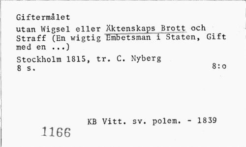 //// Giftermålet //// utan Wigsel eller Äktenskaps Brott och Straff (En wigtig Embetsman i Staten, Gift med en ...) //// Stockholm 1815, tr. C. Nyberg 8 s. S:o //// KB Vitt. sv. polem. - 1839 //// 1186 ////