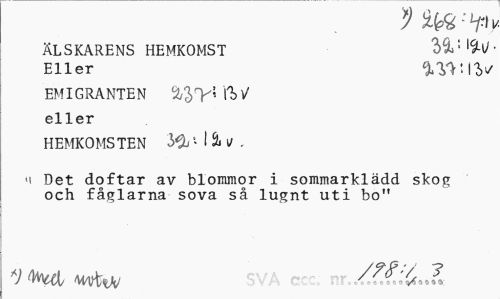 //// y m:i-h //// ÄLSKARENS HEMKOMST //// Eiier w-iv //// EMIGRANTEN a^i ftV //// eller //// HEMKOMSTEN I SM/. //// <i Det doftar av blommor i sommarklädd skog och fåglarna sova så lugnt uti bo" //// ¦V wiw ////