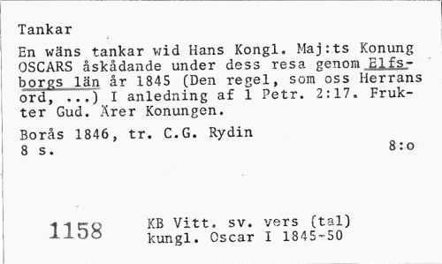 //// Tankar //// En wäns tankar wid Hans Kongl. Maj:ts Konung OSCARS åskådande under dess resa genom Elfsborgs län år 1845 (Den regel, som oss Herrans ord, ...) I anledning a£ 1 Petr. 2:17. Frukter Gud. Ärer Konungen. //// Borås 1846, tr. C.G. Rydin //// 8 s. 8:o //// 1-icn KB Vitt. sv. vers (tal) 1100 kungl. Oscar I 1845-50 ////