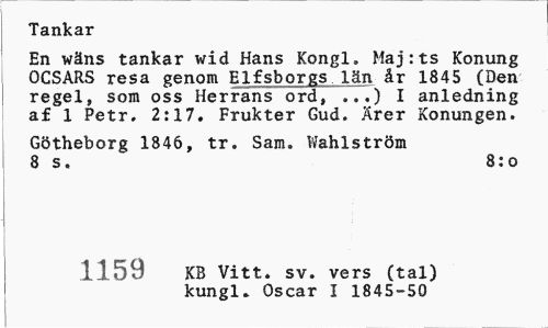 //// Tankar //// En wäns tankar wid Hans Kongl» Maj:ts Konung OCSARS resa genom Elfsborgs län år 1845 (Den regel, som oss Herrans ord, ...) I anledning af 1 Petr. 2:17. Frukter Gud. Ärer Konungen. //// Götheborg 1846, tr. Sam. Wahlström 8 s. 8:o //// 1159 KB Vitt. sv. vers (tal) //// kungl. Oscar I 1845-50 ////
