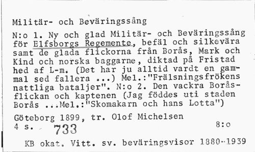 //// Militär- och Beväringssång //// N:o 1. Ny och glad Militär- och Beväringssång för Elfsborgs Regemente, befäl och silkevära samt de glada flickorna från Borås, Mark och Kind och norska baggarne, diktad på Fristad hed af L-nu (Det har ju alltid vardt en gammal sed fallera ...) Mel.:"Frälsningsfrökens nattliga bataljer". N:o 2. Den vackra Boråsflickan och kaptenen (Jag föddes uti staden Borås ...Mel.:"Skomakarn och hans Lotta") //// Göteborg 1899, tr. Olof Michelsen //// 4 s. 733 8:0 //// KB okat» Vitt. sv. beväringsvisor 1880-1939 ////