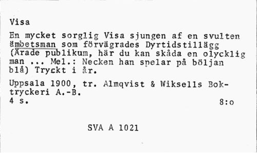 //// Visa //// En mycket sorglig Visa sjungen af en svulten ämbetsman som förvägrades Dyrtidstillägg (Ärade publikum, här du kan skåda en olycklig man ... Mel.: Necken han spelar på böljan blå) Tryckt i år. //// Uppsala 1900, tr. Almqvist & Wiksells Boktryckeri A.-B. //// 4 s. 8:0 //// SVA A 1021 ////