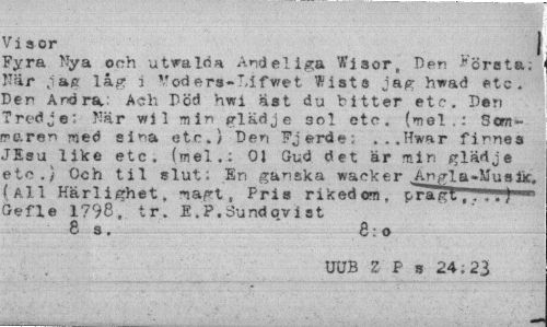 //// Visor | //// Fyra Nya och utwalri* Andeliga Wiaor, Ben Körsta; När ; ap låg i **od ers-Lifwet liatö jag hwad etc. Den Andra: A«h Död hwi ast du bitter etc. Den Tredje". När wil min glädje sol etc. (mel,: Scm-re.ren med sina etc.} Den Fjerde; . ..Hwar finnea JEsu like etc. (mel.; 01 Gud det är min glädje etc.} Och til slut: En ganska waeker ^Angla-Mu s lic, f Al 1 Kärlierhet, magt s Pris rikedom, prasrl,. Gefle 1798. tr. E.P.Sundovist //// 8 s. 8:o //// UUB Z P s 24.23 ////