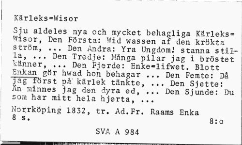 //// Kärleks=Wisor //// Sju aldeles nya och mycket behagliga Kärleks= Wisor, Den Första: Wid wassen af den krökta ström, ... Den Andra: Yra Ungdom.' stanna stilla, ... Den Tredje: Många pilar jag i bröstet känner, ... Den Fjerde: Enke-lifwet. Blott Bnkan gör hwad hon behagar ... Den Femte: Då jag törst på kärlek tänkte, ... Den Sjette: An minnes jag den dyra ed, ... Den Sjunde: Du som har mitt hela hjerta, ... //// Norrköping 1832, tr. Ad.Fr. Raams Enka 8 s. 8:0 //// SVA A 984 ////