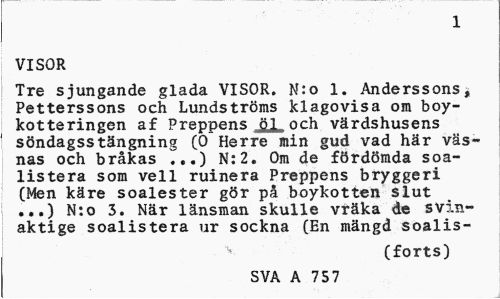 //// 1 //// VISOR //// Tre sjungande glada VISOR. N:o 1. Anderssonst Petterssons och Lundströms klagovisa om boy-kotteringen af Preppens öl och värdshusens söndagsstängning (0 Herre min gud vad här väsnas och bråkas T..) N:2. Om de fördömda soa-listera som vell ruinera Preppens bryggeri (Men käre soalester gör på boykotten slut ...) N:o 3. När länsman skulle vräka de svin-aktige soalistera ur sockna (En mängd soalis- //// (forts) //// SVA A 757 ////