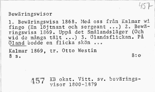 //// L/5'h //// Bewäringswisor //// L Bewäringswisa 186 8. Med oss från Kalmar wi fingo (En löjtnant och sergeant »„.) 2» Bewä-ringswisa 1869. Uppå det Smålandsläger (Och wid de många tält ...) 3. öl ands flickan. På Öland bodde en flicka skön //// Kalmar 1869, tr, Otto Westin 8 s. 8: o //// 1^7 X3 okat. Vitt. sy. bevärings-* visor 1800-18 79 ////