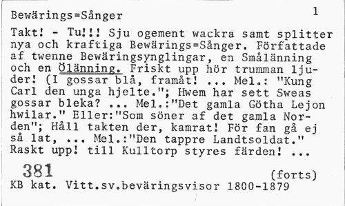 //// Bewärings=Sånger * //// Takt! - Tu.1!: Sju ogement wackra samt splitter nya och kraftiga Bewärings=Sånger. Författade af twenne Bewäringsynglingar, en Smålänning och en ölänning. Friskt upp hör trumman ljuder! (I gossar blå, framåt! ... Mel.: "Kung Carl den unga hjelte."; Hwem har sett Sweas gossar bleka? ... Mel.:"Det gamla Götha Lejon hwilar." Eller:"Som söner af det gamla Norden"; Håll takten der, kamrat! För fan gå ej så lat, ... Mel.:"Den tappre Landtsoldat." Raskt upp! till Kulltorp styres färden! ... //// 381 (forts) //// KB kat. Vitt.sv.beväringsvisor 1800-1879 ////
