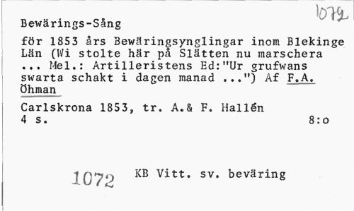 //// Bewärings-Sang //// för 1853 års Bewäringsynglingar inom Blekinge Län (Wi stolte här på Slätten nu marschera ... Mel.: Artilleristens Ed:"Ur grufwans swarta schakt i dagen manad ...") Af F.A. öhman //// Carlskrona 1853, tr. A.& F. Hallén 4 s. 8:o //// | Qjij KB Vitt. sv, beväring ////