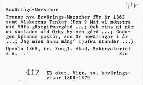 //// Bewärings-Marscher //// Trenne nya Bevärings-Marscher för år 1865 samt Älskarens Tankar (Den 9 Maj wi mönstra wid Säfs gästgifwargård ...; Och mins ni när wi-samlades wid örby by och gård ...; Godagen Upl ands gossar, som är bewäringar i år ...; Jag mins ännu mång" ljufwa stunder //// Upsala 1865, tr. Kongl» Akad. Boktryckeriet 8 s» . 8:o //// 417 //// KB okat. Vitt. sv. bevärings-visor 1800-1879 ////
