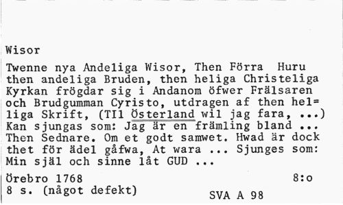 //// Wisor //// Twenne nya Andeliga Wisor, Then Förra Huru then andeliga Bruden, then heliga Christeliga Kyrkan frögdar sig i Andanom öfwer Frälsaren och Brudgumman Cyristo, utdragen af then hel= liga Skrift, (Til Österland wil jag fara, ...) Kan sjungas som: Jag är en ^främling bland ... Then Sednare. Om et godt samwet. Hwad är dock thet för ädel gåfwa, At wara ... Sjunges som: Min själ och sinne låt GUD ... //// Örebro 1768 8:0 //// 8 s. (något defekt) SVA A gg ////