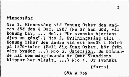 //// 1 //// Minnessång //// N:o 1. Minnessång vid Konung Oskar den andres död den 8 Dec. 1907 (Nu är han död, vår konung kär, ... Mel.: "Ur svenska hjertans djup en gång".) N:o 2, Hyllningssång till Konung Oskar den andre vid ett besök i Malmö på 1870-talet (Hell dig Kung Oskar, hör från våra bygder ...) N:o 3. Östersjön. Du blånande haf som mångtusende år (mot Skandiens klippor har slagit, .,.) N:o 4. Ur svenska //// (forts) //// SVA A 769 ////