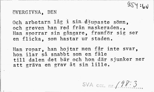 //// :Wvi //// ÖVERGIVNA, DEN //// Och arbetarn låg i sin djupaste sömn, och greven han red från maskeraden., Han sporrar sin gångare, framför sig ser en flicka, som hastar ur staden. //// Han ropar, han hojtar men får inte svar, hon ilar så snabbt som en fåle till dalen det bär och hon där sjunker ner att gräva en grav åt sin lille. //// SVA cc . -.r/f?:3... ////